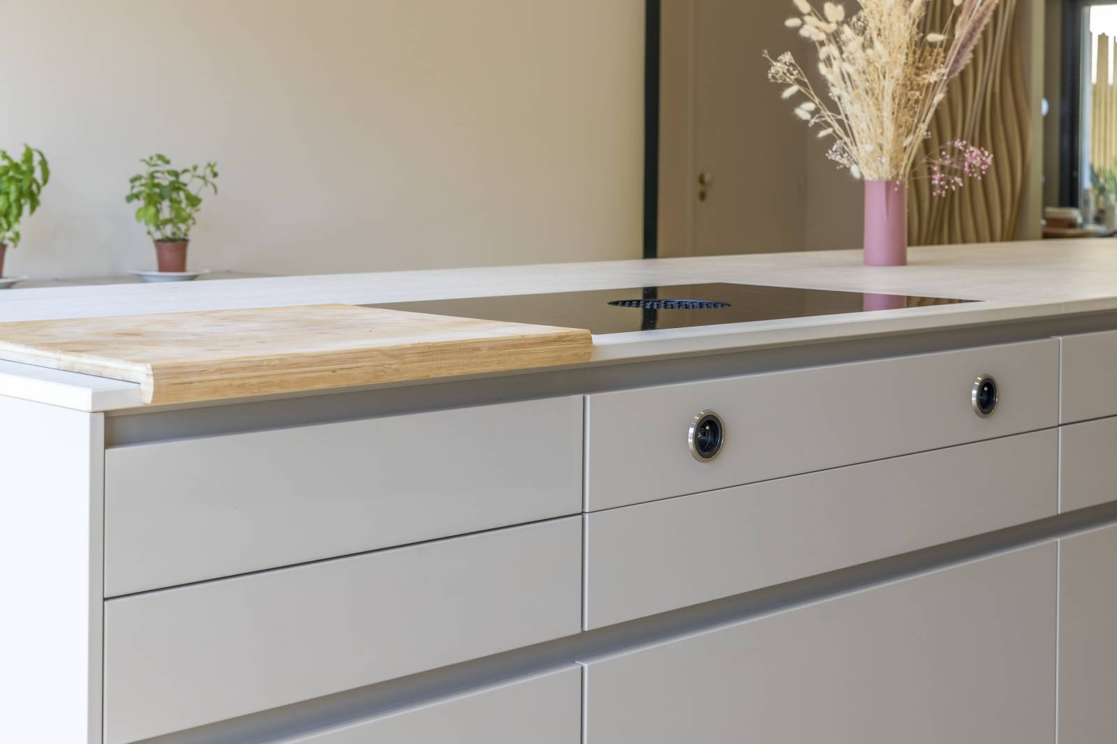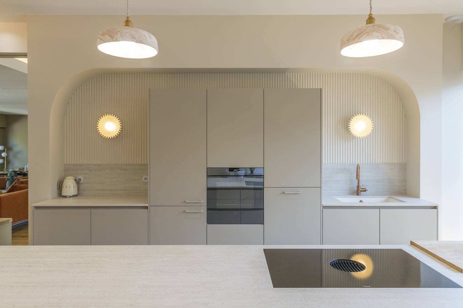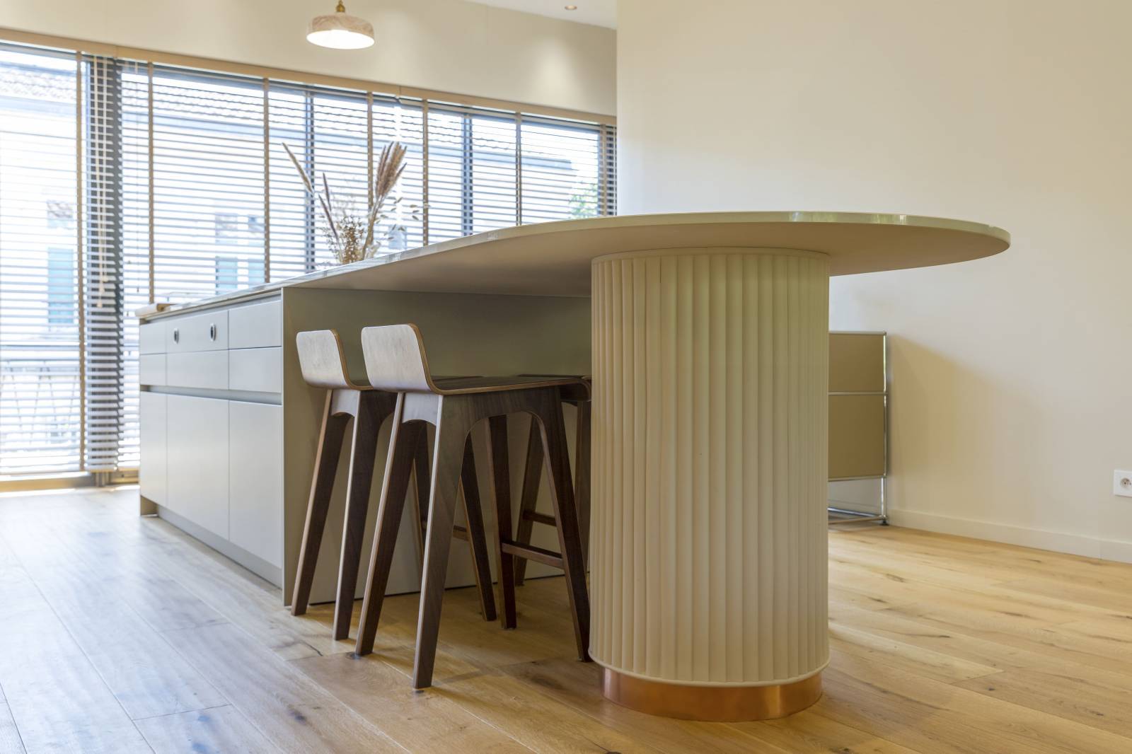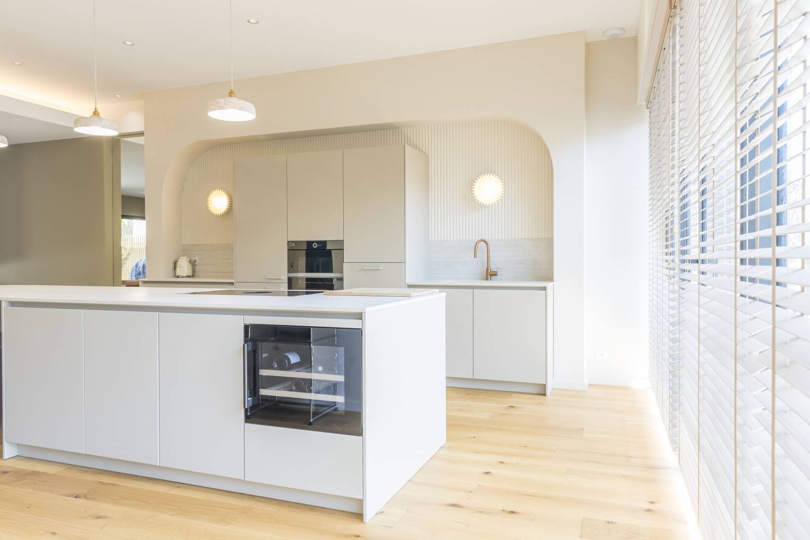 Au cœur du quartier prisé de Saint-Seurin à Bordeaux, cette maison de centre-ville accueille une cuisine haut de gamme signée Créations Saint Bruno, alliant élégance et fonctionnalité. Les façades en laque mate coloris Les Couleurs® Le Corbusier® de la gamme LEICHT apportent une touche contemporaine tout en s’intégrant parfaitement à l’architecture bordelaise. Les panneaux muraux 3D, sublimés par des appliques intégrées, créent une ambiance chaleureuse et sculpturale. Les plans de travail en céramique effet travertin se prolongent sur un îlot central majestueux, dont le piètement sur mesure arrondi repose sur une embase en cuivre assortie avec la robinetterie. L’électroménager de pointe, avec un four V-ZUG et une plaque de cuisson BORA à aspiration intégrée, garantit performance et discrétion. L’ensemble repose sur un parquet en chêne massif, soulignant le caractère noble et intemporel de cette réalisation d’exception, pensée pour les esthètes et les passionnés de cuisine.