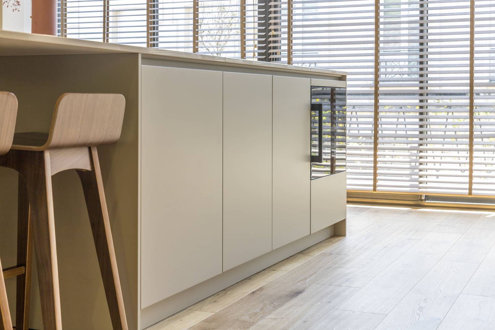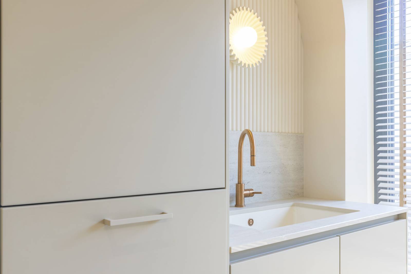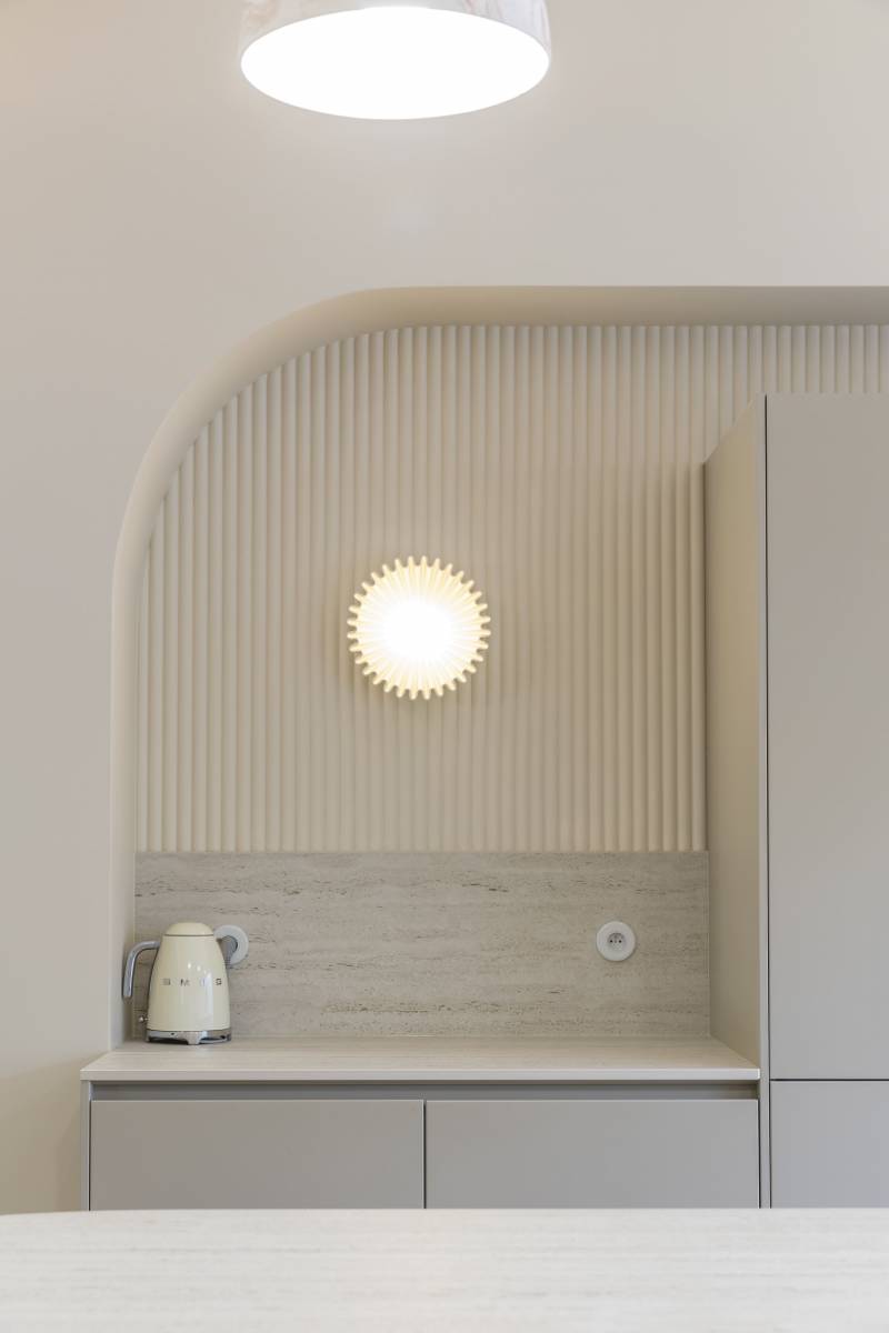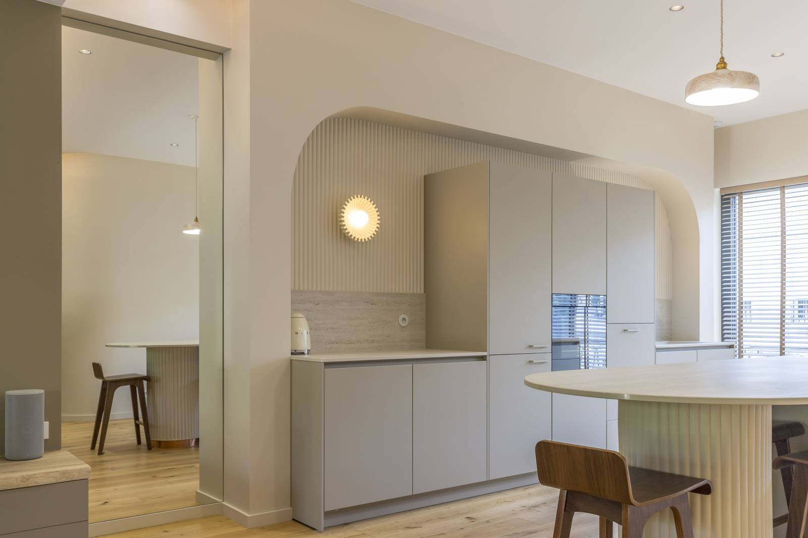 Au cœur du quartier prisé de Saint-Seurin à Bordeaux, cette maison de centre-ville accueille une cuisine haut de gamme signée Créations Saint Bruno, alliant élégance et fonctionnalité. Les façades en laque mate coloris Les Couleurs® Le Corbusier® de la gamme LEICHT apportent une touche contemporaine tout en s’intégrant parfaitement à l’architecture bordelaise. Les panneaux muraux 3D, sublimés par des appliques intégrées, créent une ambiance chaleureuse et sculpturale. Les plans de travail en céramique effet travertin se prolongent sur un îlot central majestueux, dont le piètement sur mesure arrondi repose sur une embase en cuivre assortie avec la robinetterie. L’électroménager de pointe, avec un four V-ZUG et une plaque de cuisson BORA à aspiration intégrée, garantit performance et discrétion. L’ensemble repose sur un parquet en chêne massif, soulignant le caractère noble et intemporel de cette réalisation d’exception, pensée pour les esthètes et les passionnés de cuisine.