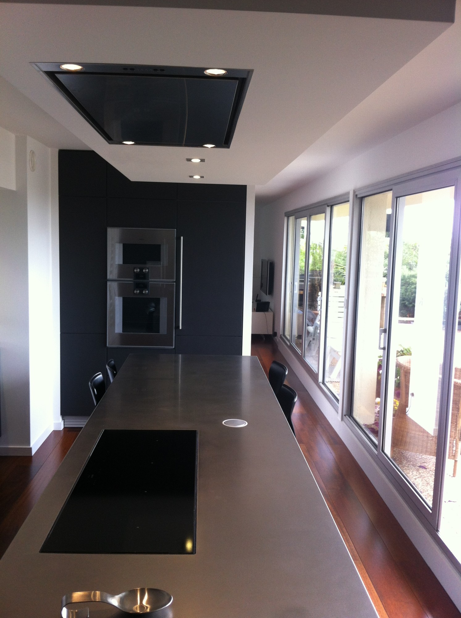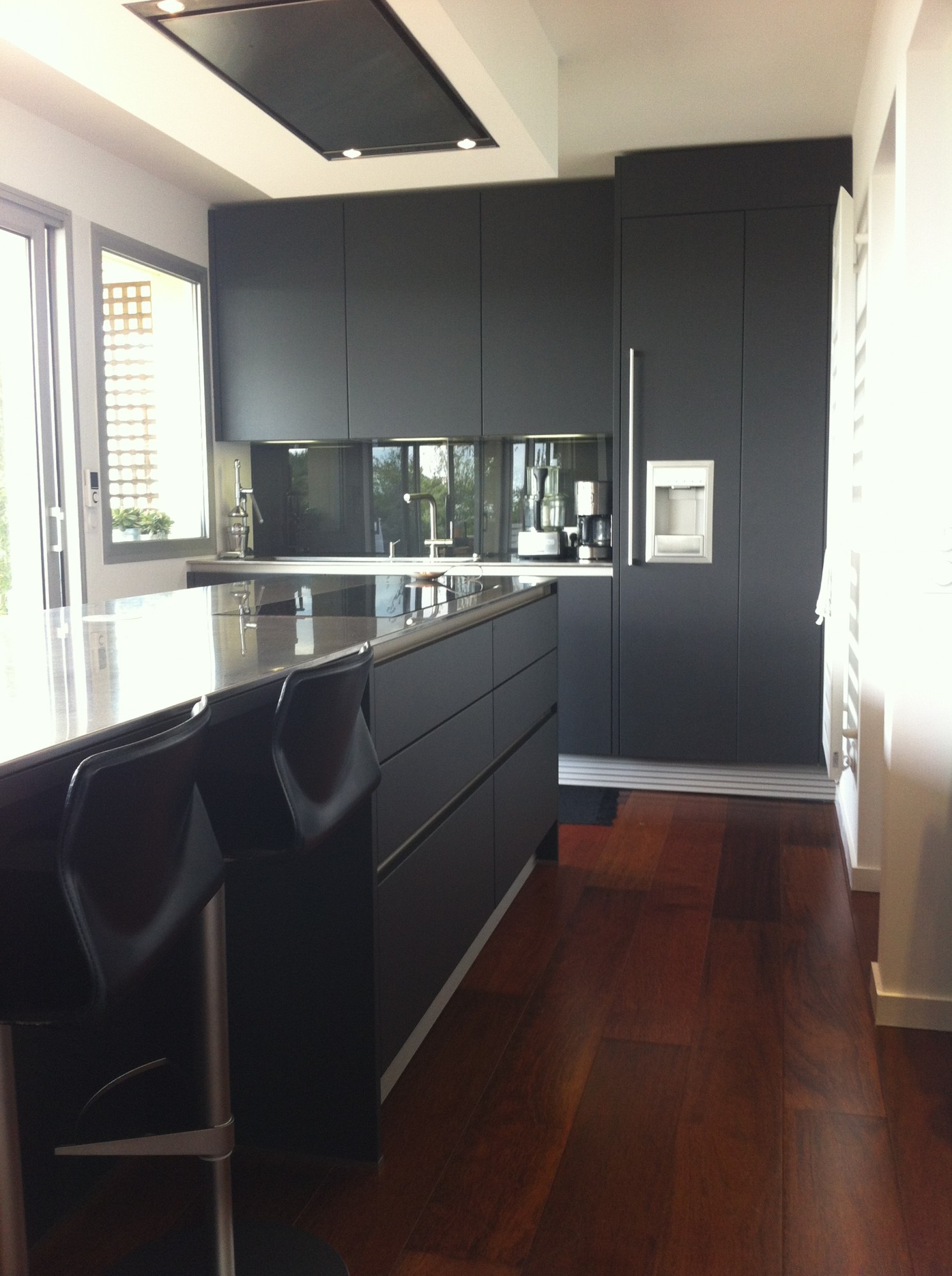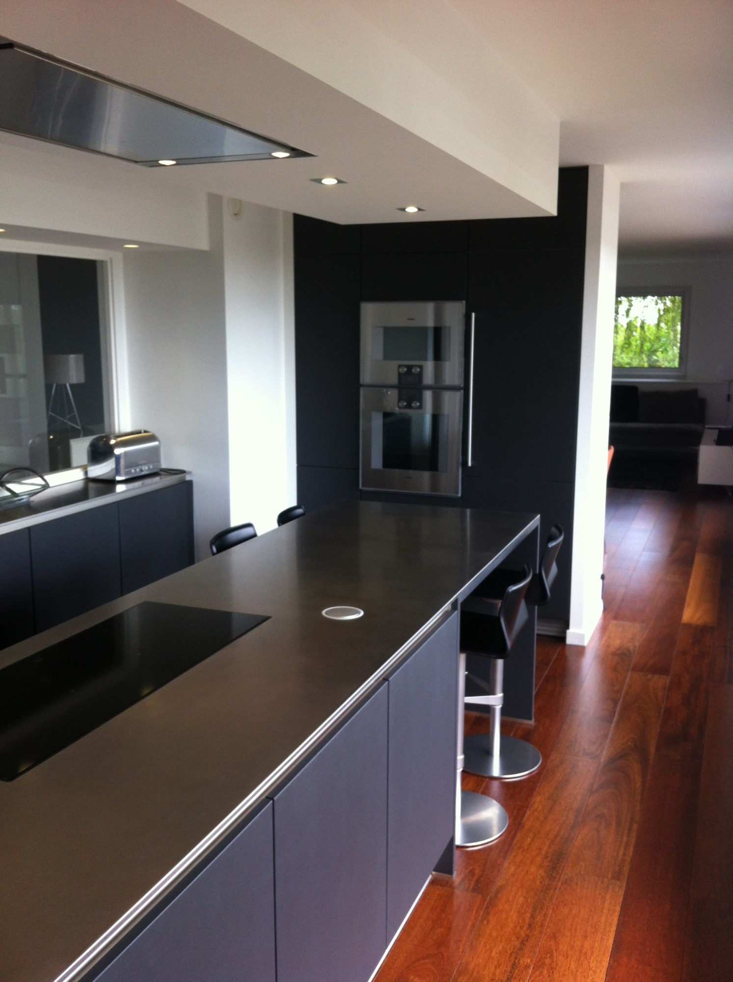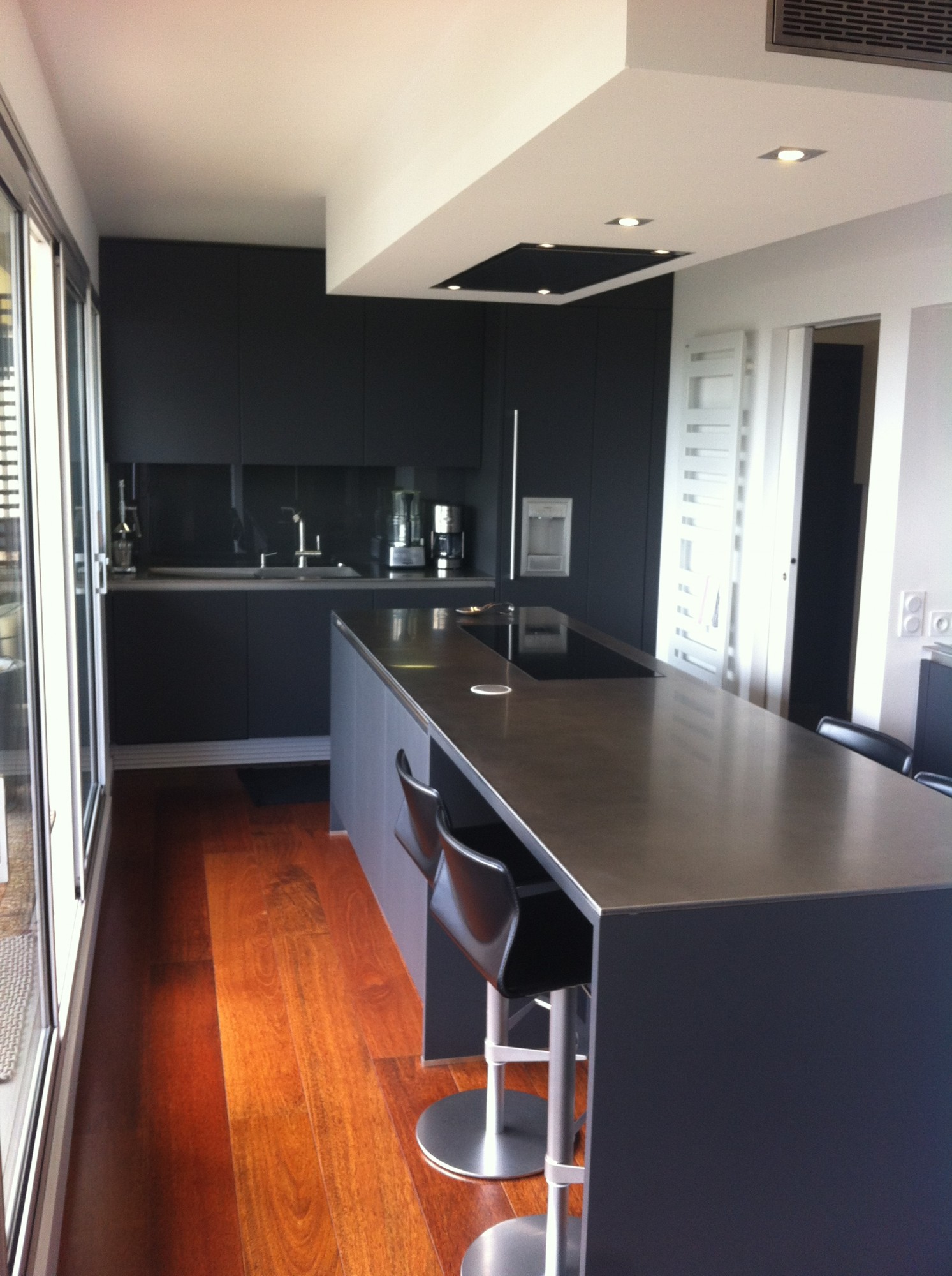 Ci dessous, découvrez une superbe réalisation haut de gamme, conçue et réalisée par nos soins. L'alliance d'une laque noire, à l'aspect satinée, intemporelle et chic alliée à l'inox, produit haut de gamme idéal en cuisine, le tout réchauffé par la présence du Merbau au sol. L'ouverture vitrée sur le couloir, permet à cette cuisine de s'inscrire pleinement au centre de cette habitation. Baignée de lumière, cette le mobilier noir s'habille de teintes sobres et chic et renvoie la lumière le tout souligné par le plan de travail en inox vibré, travaillé dans la masse.